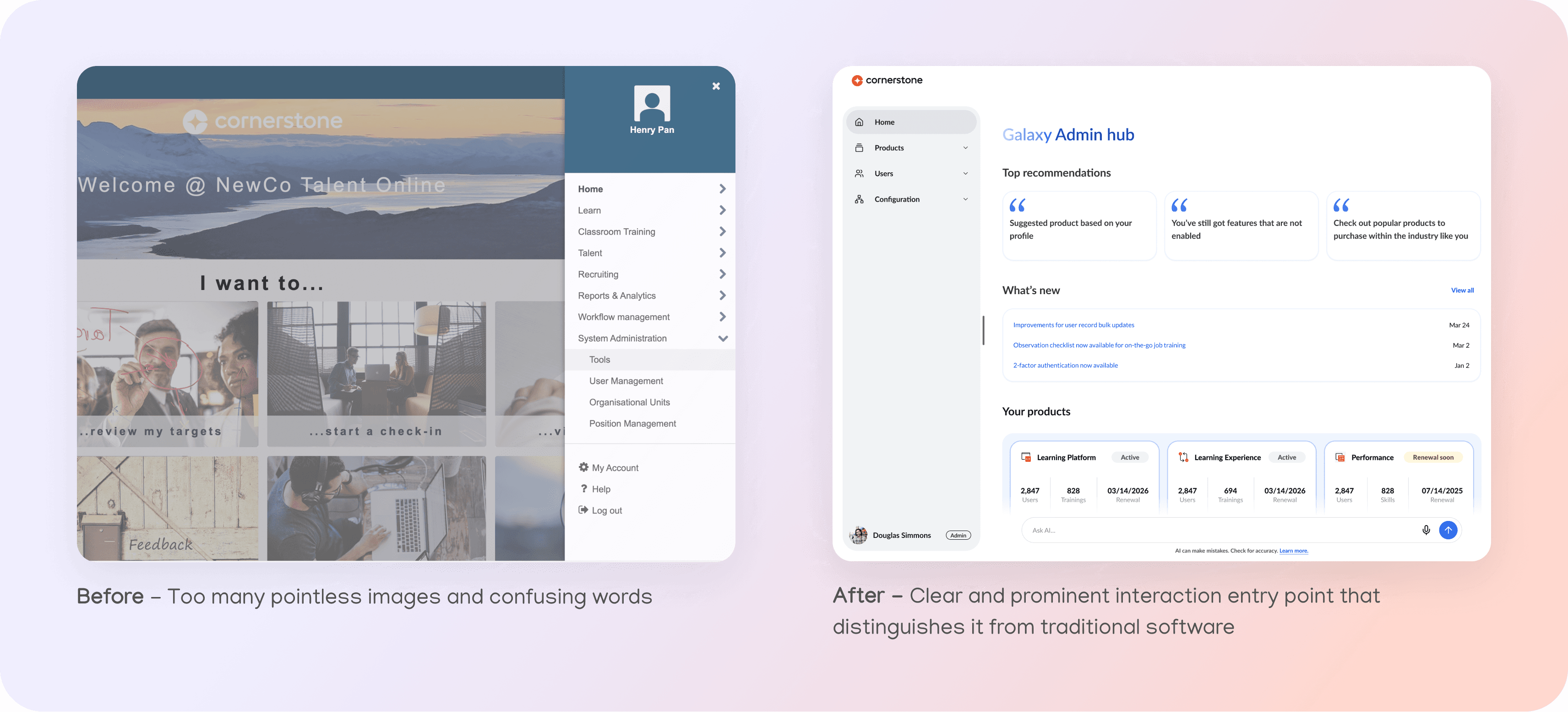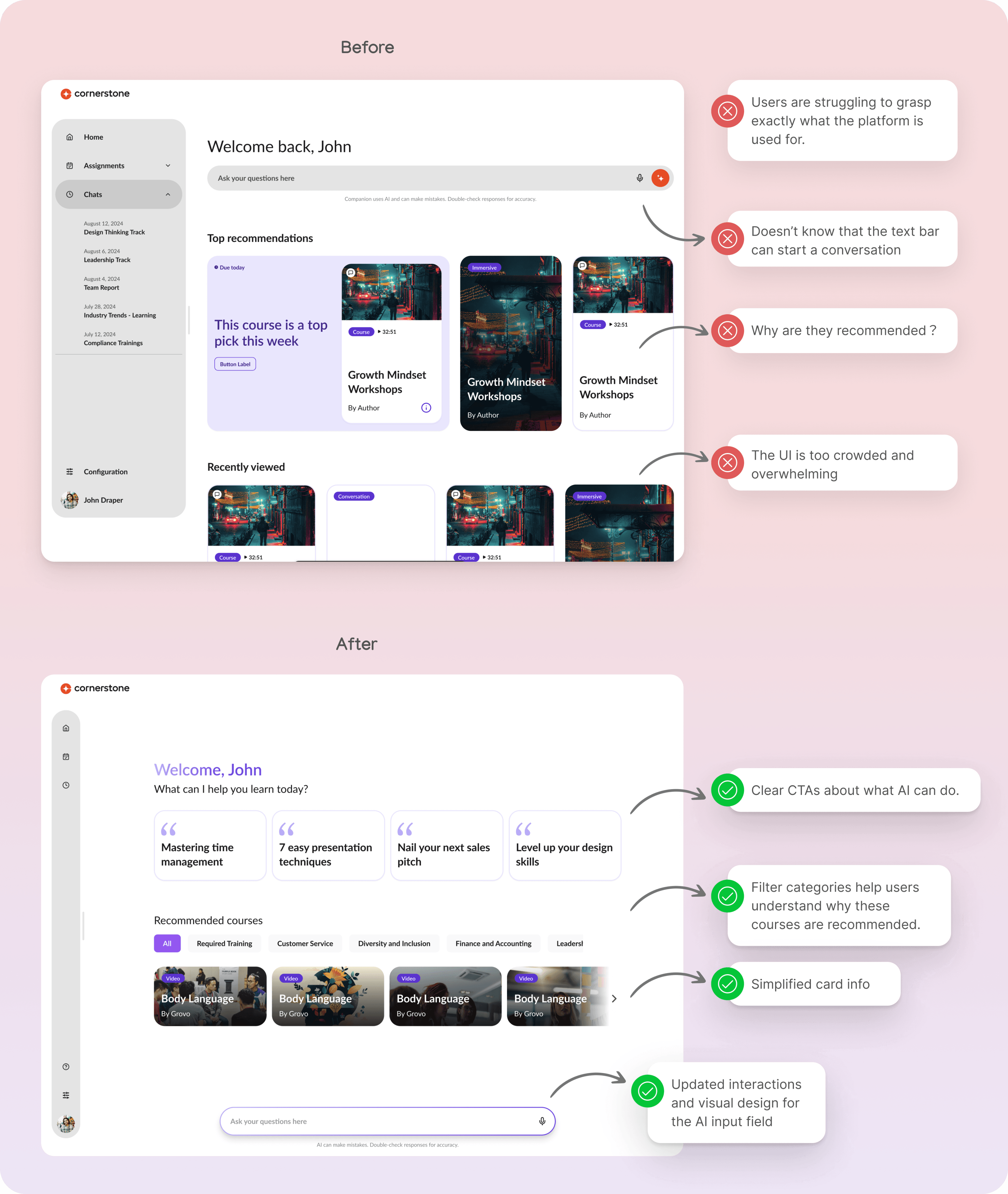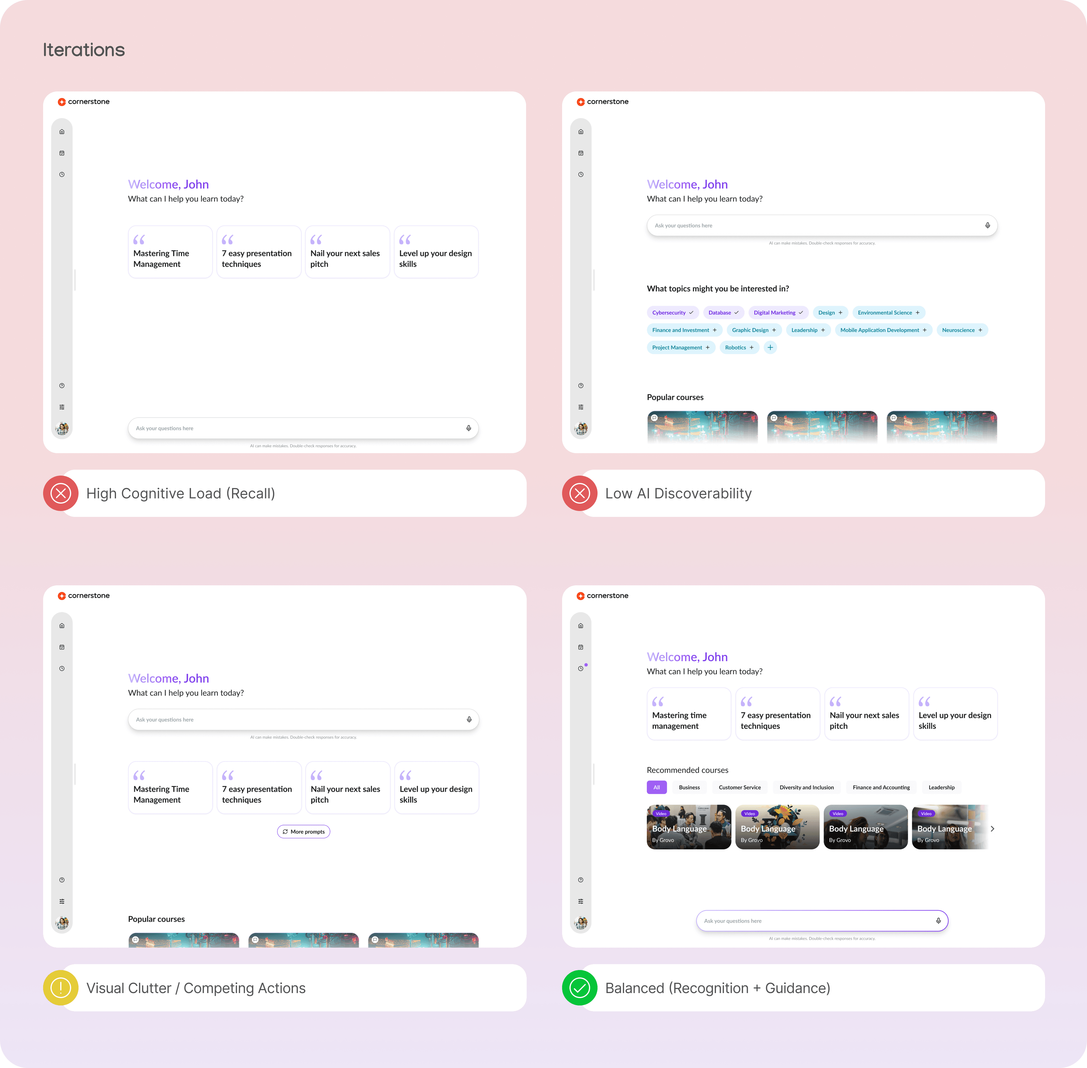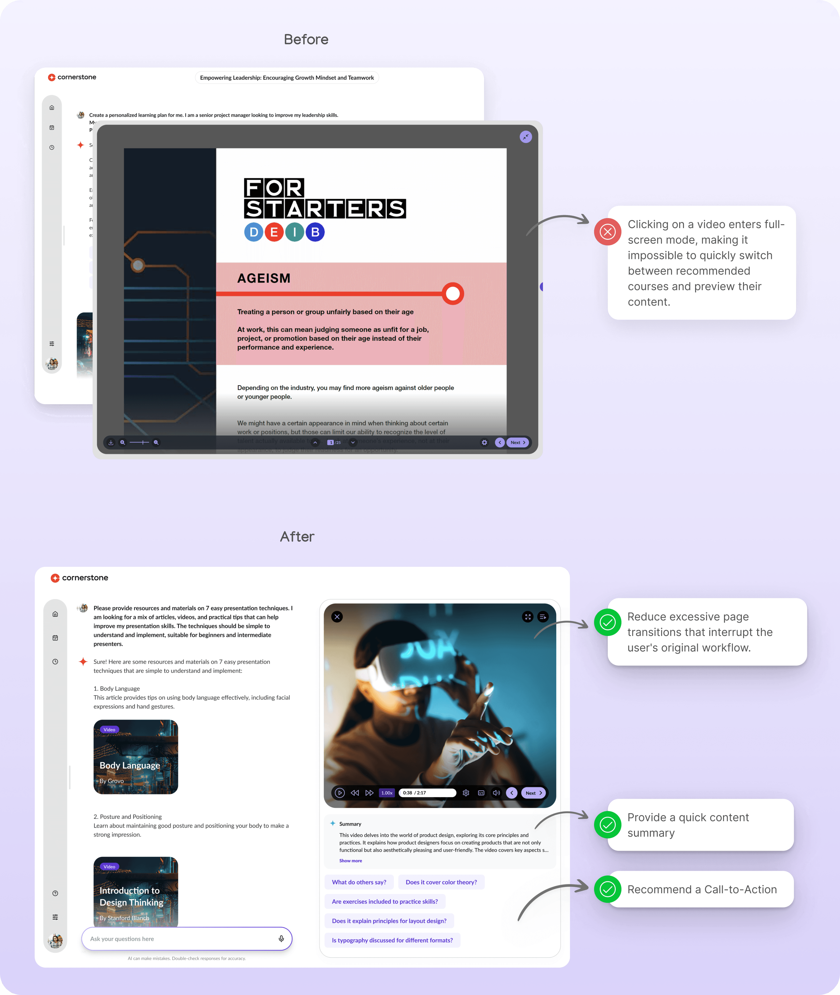 Served as the main contact for AI-enabled experiences at Cornerstone, leading the Admin experience and partnering with another designer on the Learner experience. Reviewed AI use cases and recommended new design patterns and components.